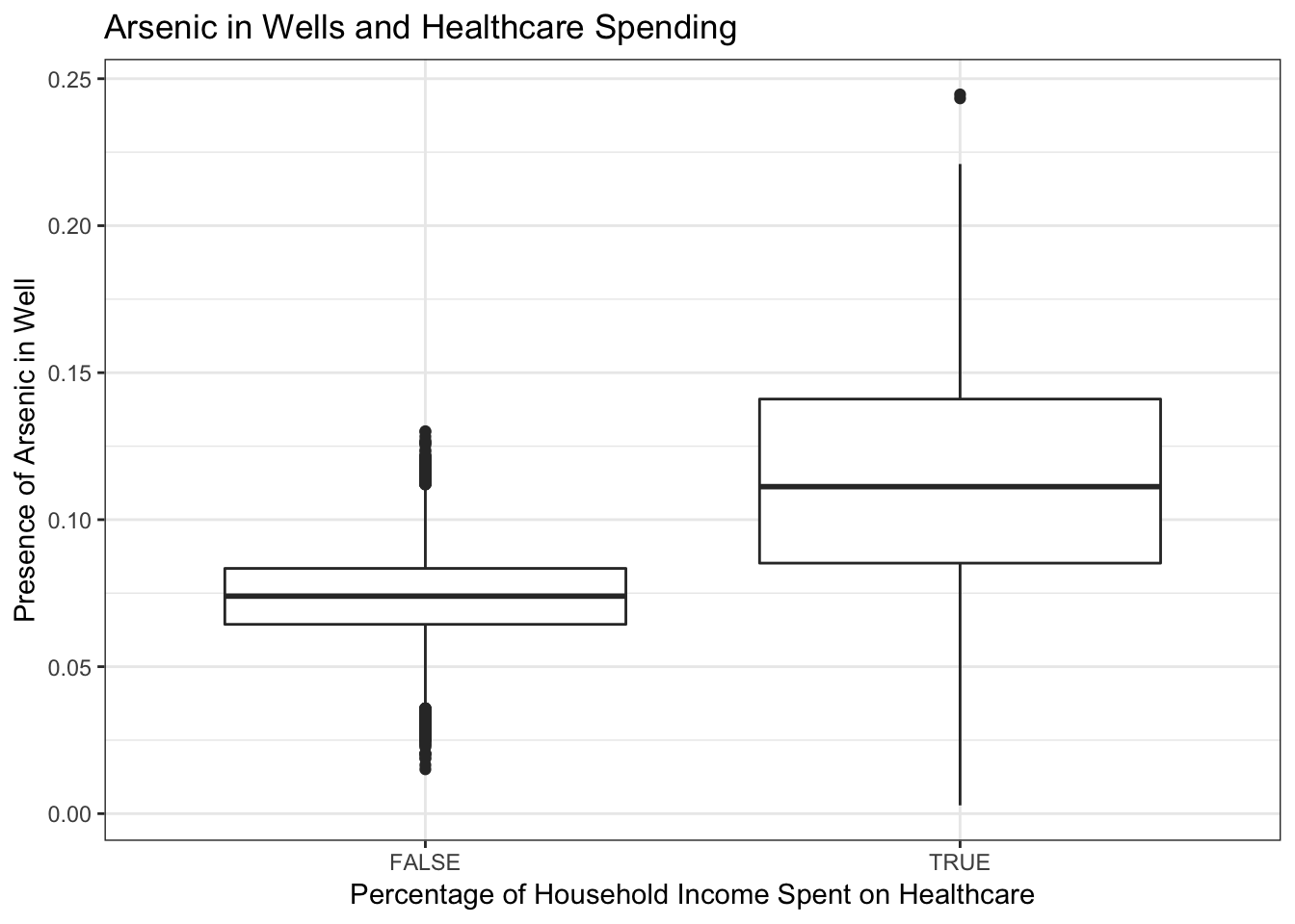 The presence of arsenic in a well does lead to an increase in percentage of household income spent on healthcare. When there is no arsenic in the well, the percentage of household income spent on healthcare is on average .07%. When there is arsenic in the well, the percentage of household income spent on healthcare is on average .11%.