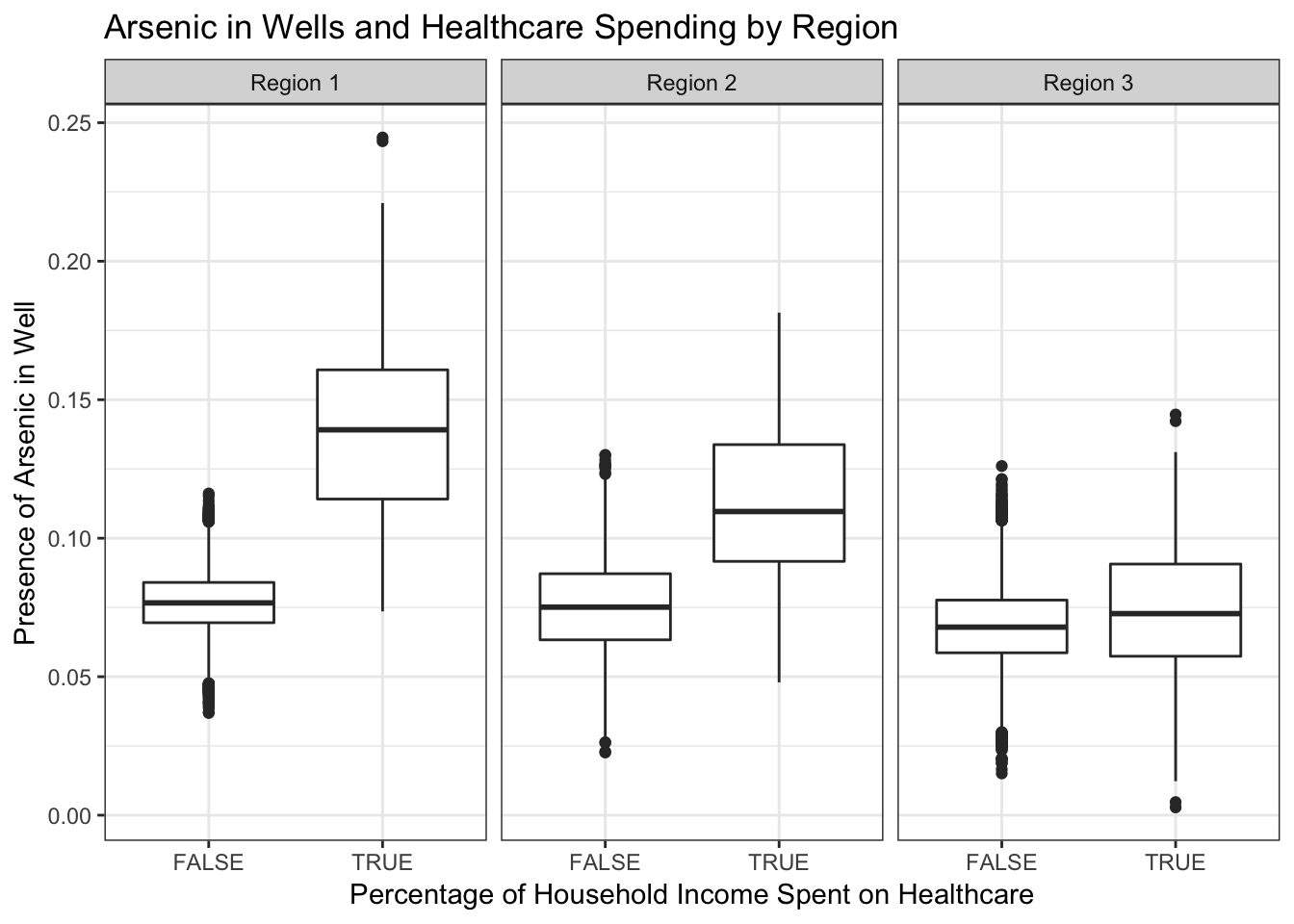 When analyzing this effect by region, it is found that for Region 1 there is an average of 0.06% increase in percentage of household income spent on healthcare when arsenic is present. For Region 2, there is an average of 0.02% increase in percentage of household income spent on healthcare when arsenic is present. For Region 3, there is an average of .05% increase in percentage of household income spent on healthcare when arsenic is precent.
