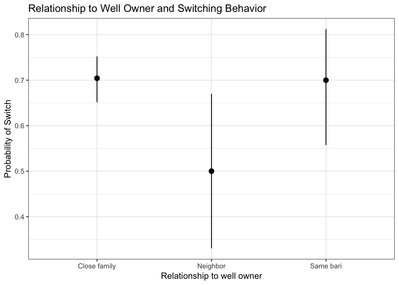 Individuals were surveyed about their relationship with the well owner, with the assumption that information about the well could be spread differently depending on how close of a tie that the individual had with the well owner. People who reported that the well owner was close family on average had a 70% likelihood of switching wells. People who reported that the well owner was a neighbor on average had a 50% likelihood of switching wells. Lastly, though not significant and therefore uncertain due to a wide confidence interval, people who reported that the well owner was in the same bari had on average a 70% likelihood of switching wells.