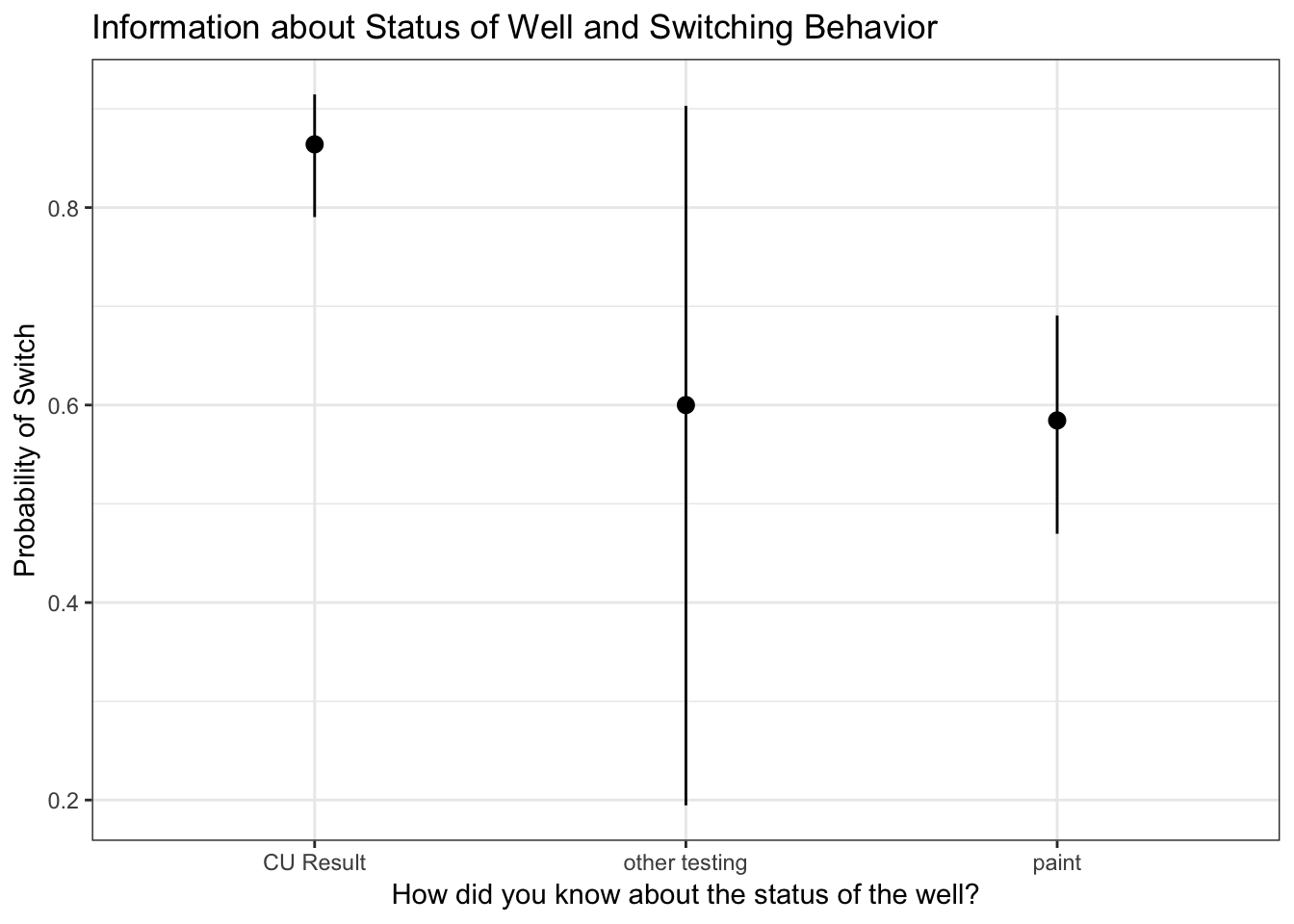 Individuals found out about the status of the well in various ways. When surveyed about how they found out about the status of the well, people who reported that they knew about the status of the well through a CU Result were on average 86% likely to switch. People who said they found out about the status of the well through the paint were on average 58% likely to switch. People who found out about the status of the well through other means were on average 60% likely to switch, but the results of people who found out about the status of the well through other means are not significant and therefore uncertain. These results indicate that a CU Card is again quite an important determinanat for well switching in households with arsenic in their wells.