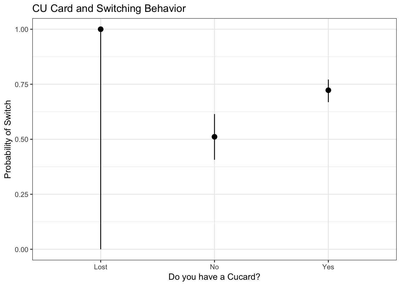 People who have a CU Medical card are most likely to switch wells when a well is found to be contaminated with arsenic. On average, people who have a CU Medical card are 72% likely to switch. People who do not have a CU Medical card are only about 51% likely to switch. However, this result is not significant because it is more uncertain, the confidence interval of switching ranges from 40% to 61%.