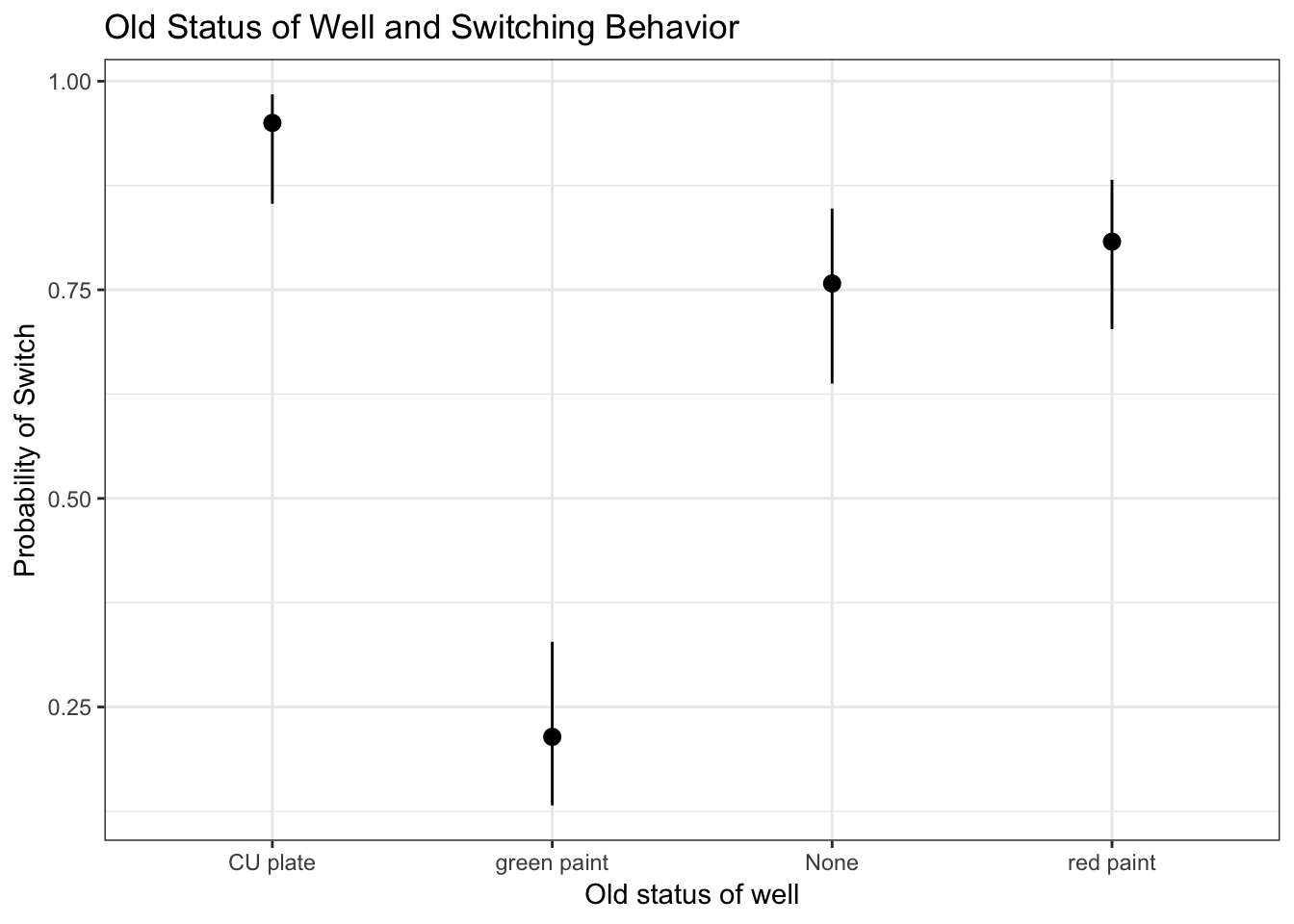 The probability of switching based on status which was visible on the well was the highest when there was a CU plate present, with an average of 95% switching based on wells that had a CU plate present. Comparatively, red paint (which is inferred to indicate a well that is not safe), only had an average of 80% switching and was not a significant result.