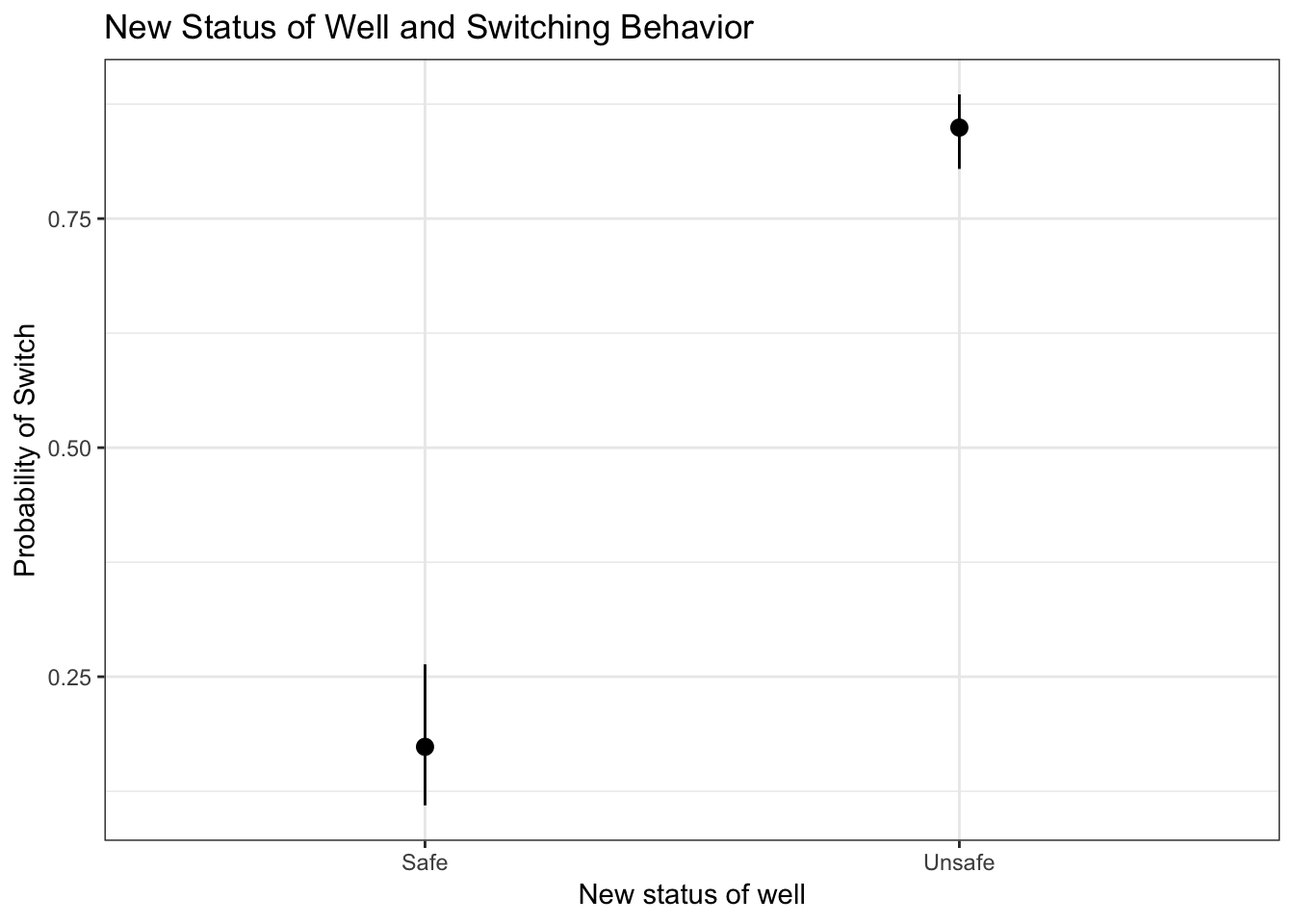 If people know that they the status of the well is unsafe, on average, they have an 86% proability of switching. If people don’t know the status of the well, they also have an 86% percent chance of switching on average. However, the people who don’t know the status of the well also have the most uncertain outcomes. The confidence interval ranges from a 68% cchance of swtiching to a 95% chance of switching, and the results are not significant. This indicates that people who don’t know the status of a well are a vulnerable group to the negative effects of wells that are contaminated by arsenic.